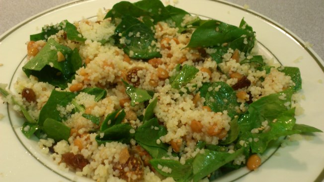 Ensalada de semola de trigo, lentejas, espinacas y frutos secos. ¡Deliciosa y completa!