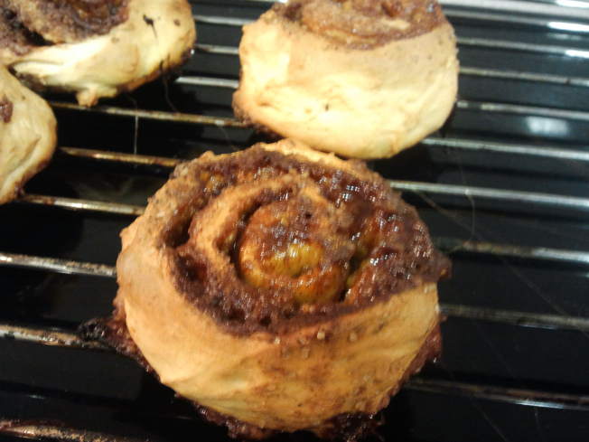 12.- Una vez enrollado, córtalo en rodajas de unos dos dedos de grosor. Córtalo también suavemente para que no se te desmonten ni te salga el azúcar ni la canela del relleno.