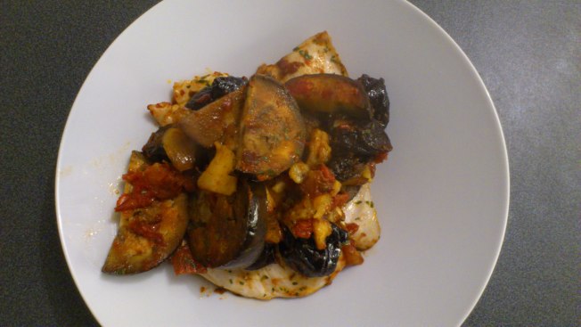 Plato principal: pollo acompañado con ciruelas, manzana, berenjena, tomate y piñones 🙂