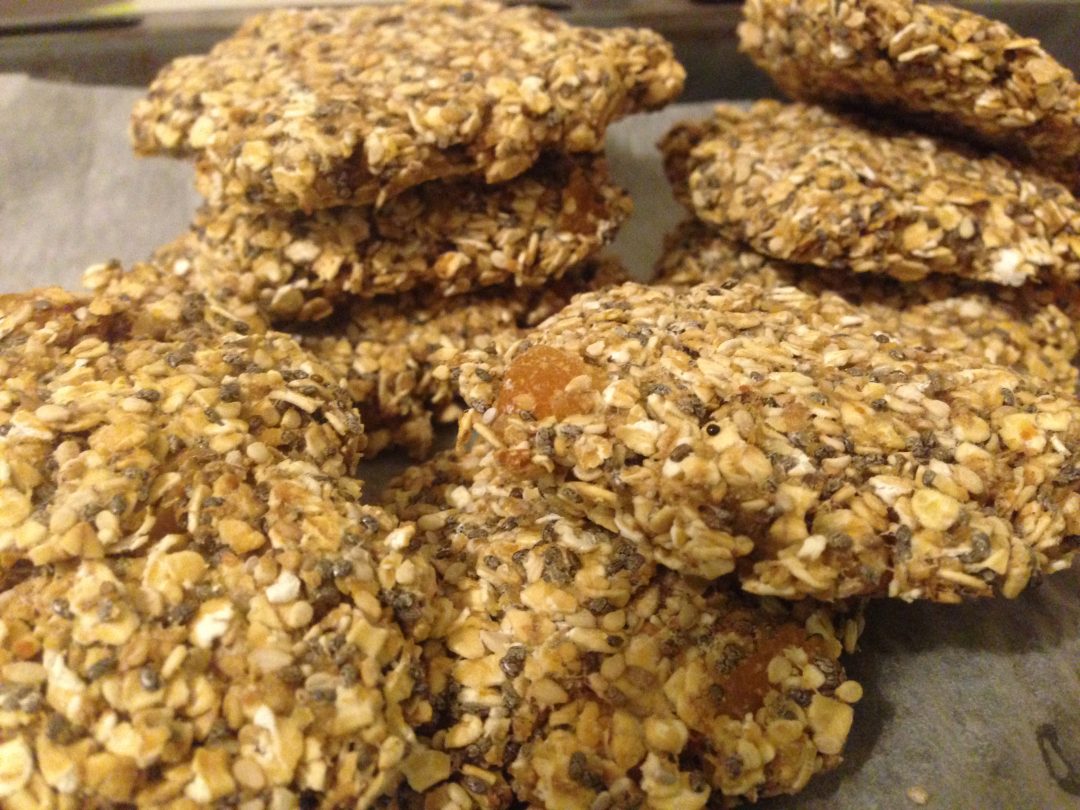 Me encantan las galletas de avena, en casi todas sus formas. Pero estaba buscando unas que no llevaran mantequilla ni kilos de azúcar para conseguir unas que fueran 100% saludables, sin renunciar a sabor ni propiedades. Y di con esta receta: no lleva mantequilla, ni huevo, ni azúcar! Gracias a un platano machacado, conseguimos el toque dulce (natural) y que se forme la galleta. También le añado albaricoques secos troceados con el que conseguimos un sabor adulzado. ¿El resto de ingredientes? Simplemente copos de avena, sésamo y yo le añado también semillas de chia y germen de trigo. Pero puedes añadirle lo que te apetezca: tal vez lino, nueces, pasas…