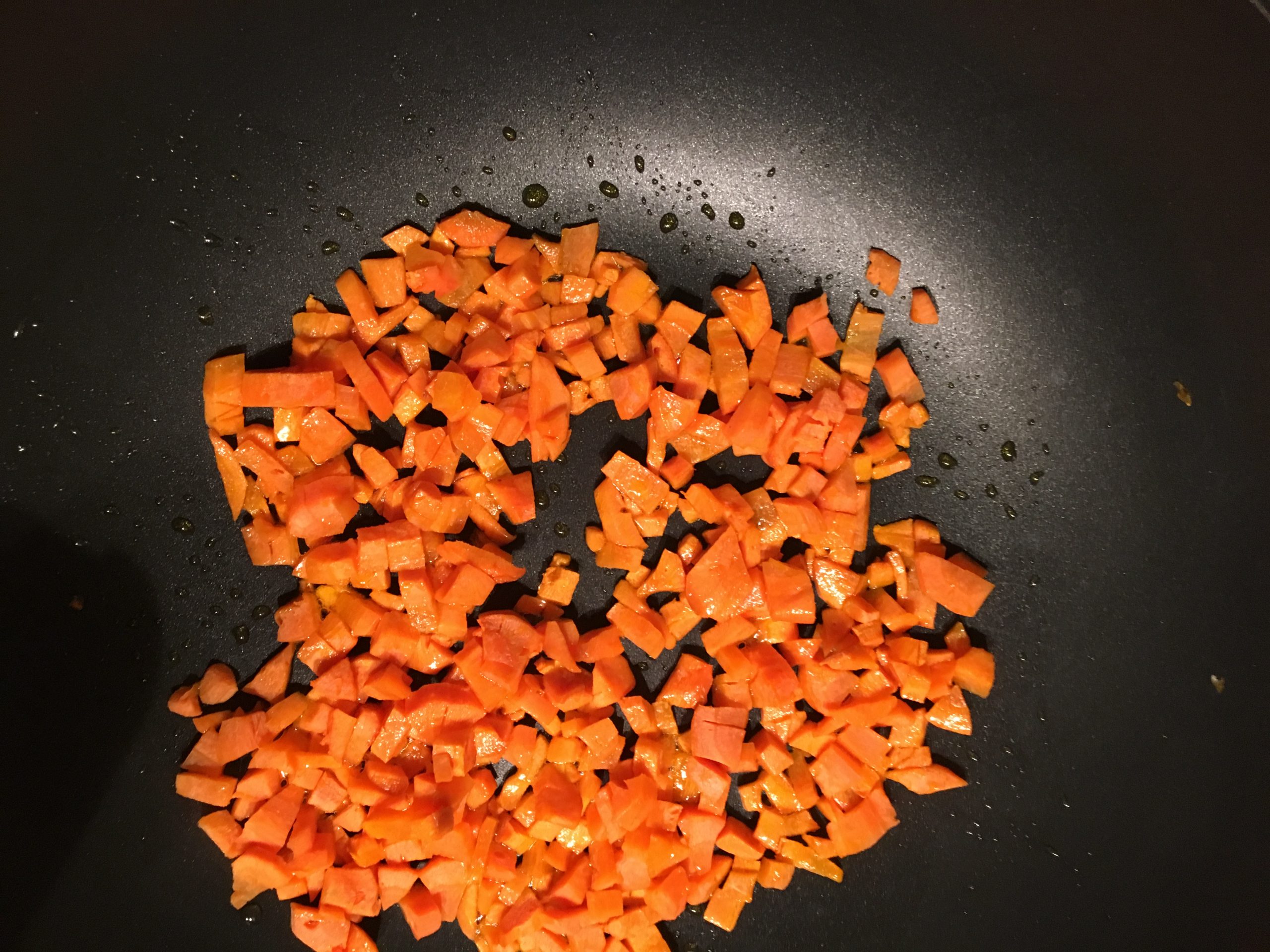 3.- Empezaremos con el curry de coco: Calienta en una sartén grande (si es tipo wok, mejor), unas 3 cucharadas de aceite de oliva. Una vez caliente, añade las zanahorias por unos 3 minutos hasta que se hayan ablandecido, cocinándolas a fuego alto.