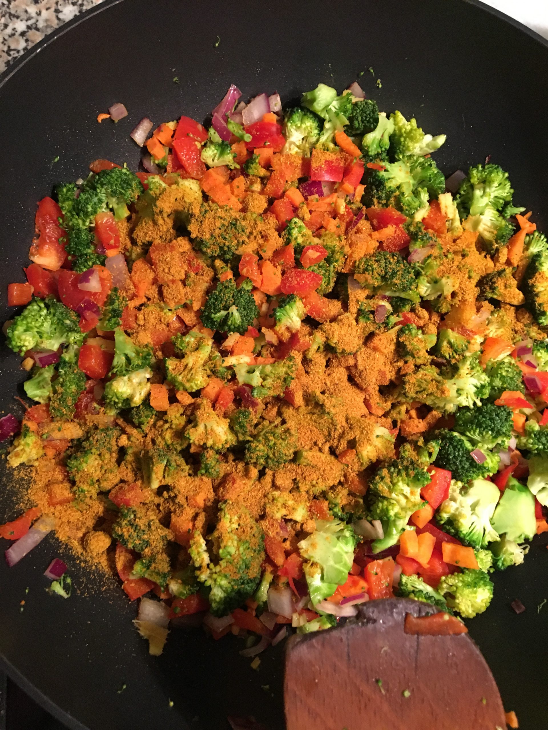 Ahora, espolvorea por encima 2 cucharadas soperas de curry en polvo, y remueve bien durante 1 minuto para que todas las verduras cojan bien el sabor del curry.