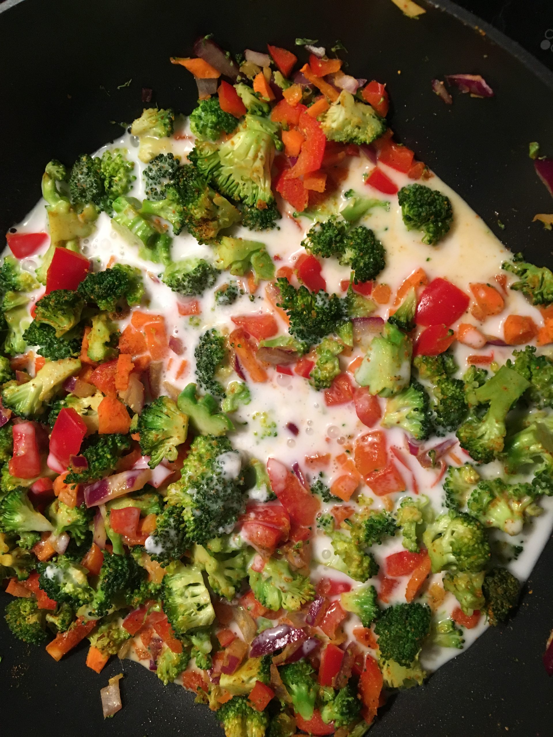 Por último, saquea la lata de leche de coco y añade a la sartén la leche de coco y una cucharadita pequeña de sal. Remueve bien para que se mezcle bien todo (la leche debería pasar a coger un color amarillento al mezclarse con el curry). Sube a fuego alto hasta que veas que la leche hierve. A la que hierva, baja a fuego medio y deja cocinar por 15 minutos, removiendo de vez en cuando. Verás que la leche se vuelve más cremosa 🙂