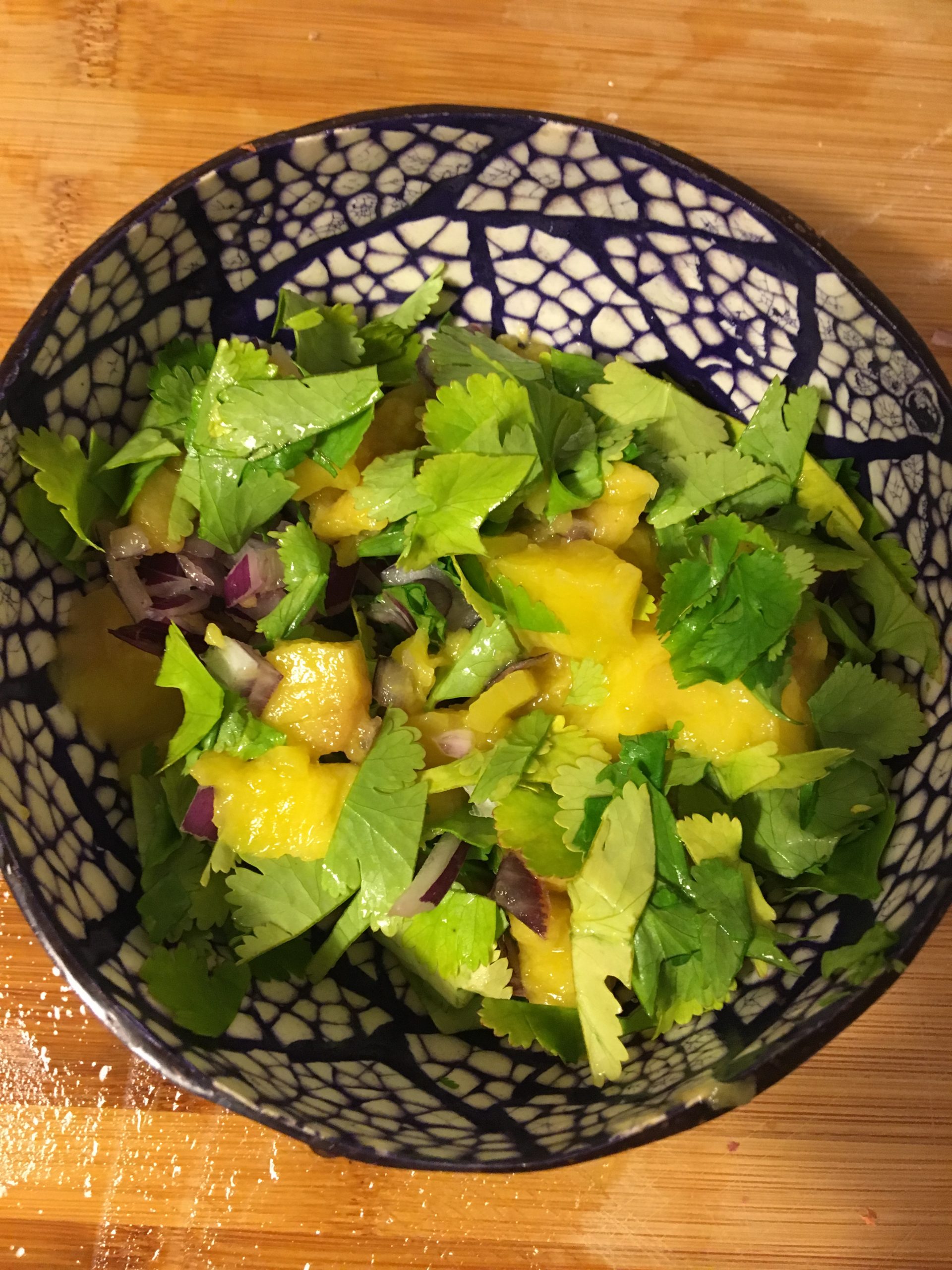 En un bol, mezcla el mango con el cilantro como si quisieras hacer una ensalada de los dos 🙂 Reserva.