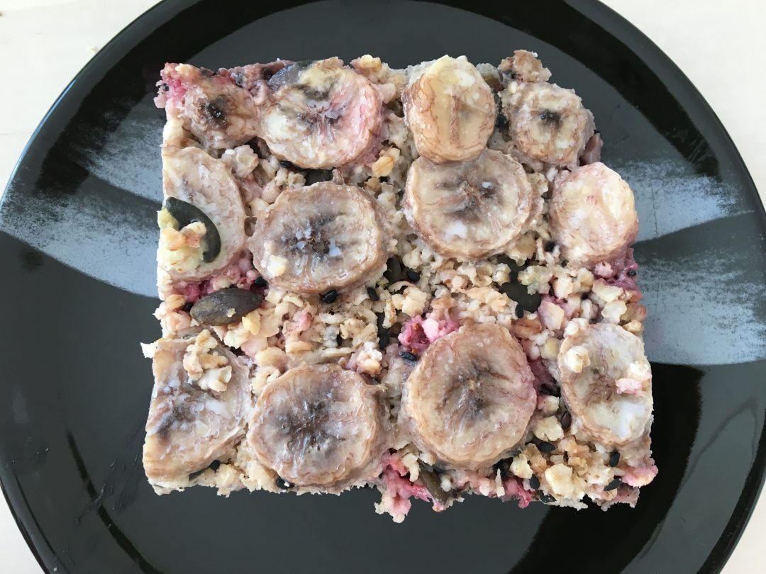 Nutritivo, delicioso, vegano, fácil de hacer y muy sano. ¿Qué mas se le puede pedir? Perfecta para el desayuno, servido caliente en invierno o frio en verano. Esta receta consiste en copos de avena horneados con fresas, plátano, pipas de girasol, nueces (opcional) y sésamo negro. Horneado con leche (vegetal) para que la avena absorba su agua y sea super digestiva cuando la consumamos, ya que no nos pedirá extra agua de nuestro cuerpo 🙂 Sin huevo ni mantequilla.